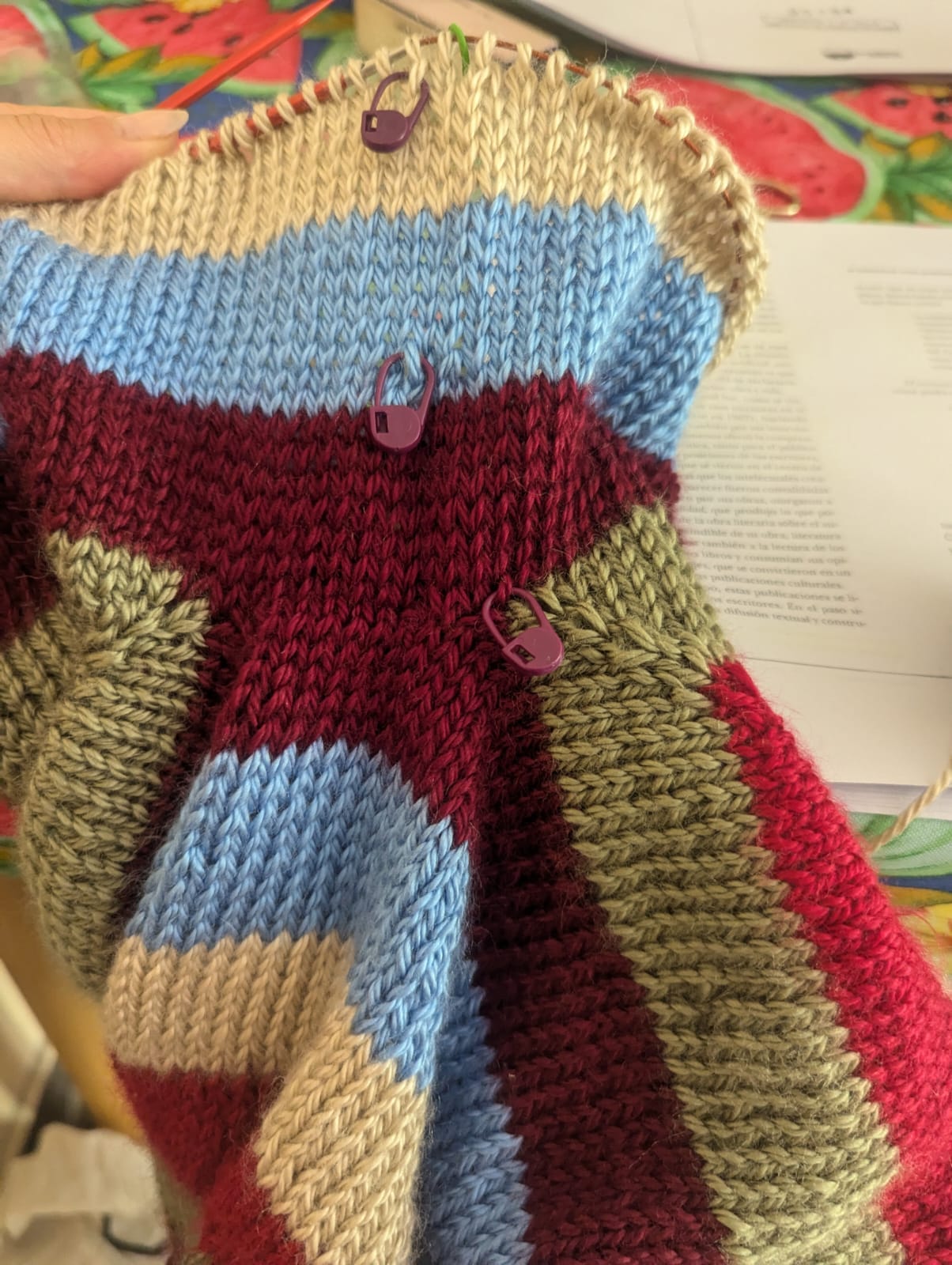 En estas esperas estoy tejiendo mucho. Hace unos años, en Berlín, aprendí a tejer con agujas circulares y descubrí que es muchísimo más fácil que hacerlo con las rectas. Sobre todo porque no hay que coser. Estoy tejiendo un suéter simple, a rayas, pero un poco complicado en la forma de construir el canesú. Pero justamente la parte complicada es la parte divertida, después del canesú ya es simplemente tejer sin pensar. Después de terminar el cuerpo, se recogen los puntos de cada manga y se levantan los puntos que van en la axila. En los suéters que había tejido antes, esta parte se me complicaba, se me formaban unos agujeros raros y no sabía cómo evitarlo. En una oportunidad, el agujero era tan grande que lo terminé cosiendo después. Miré tutoriales pero no me salía.